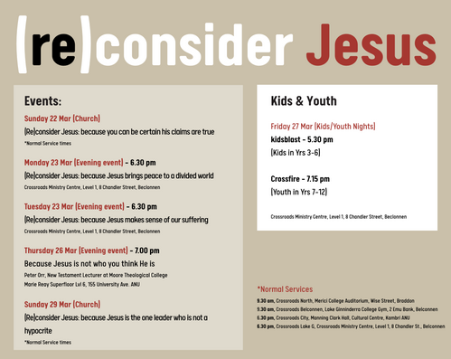 Crossroads Ministry Centre, Level 1, 8 Chandler Street, Belconnen. See map below.